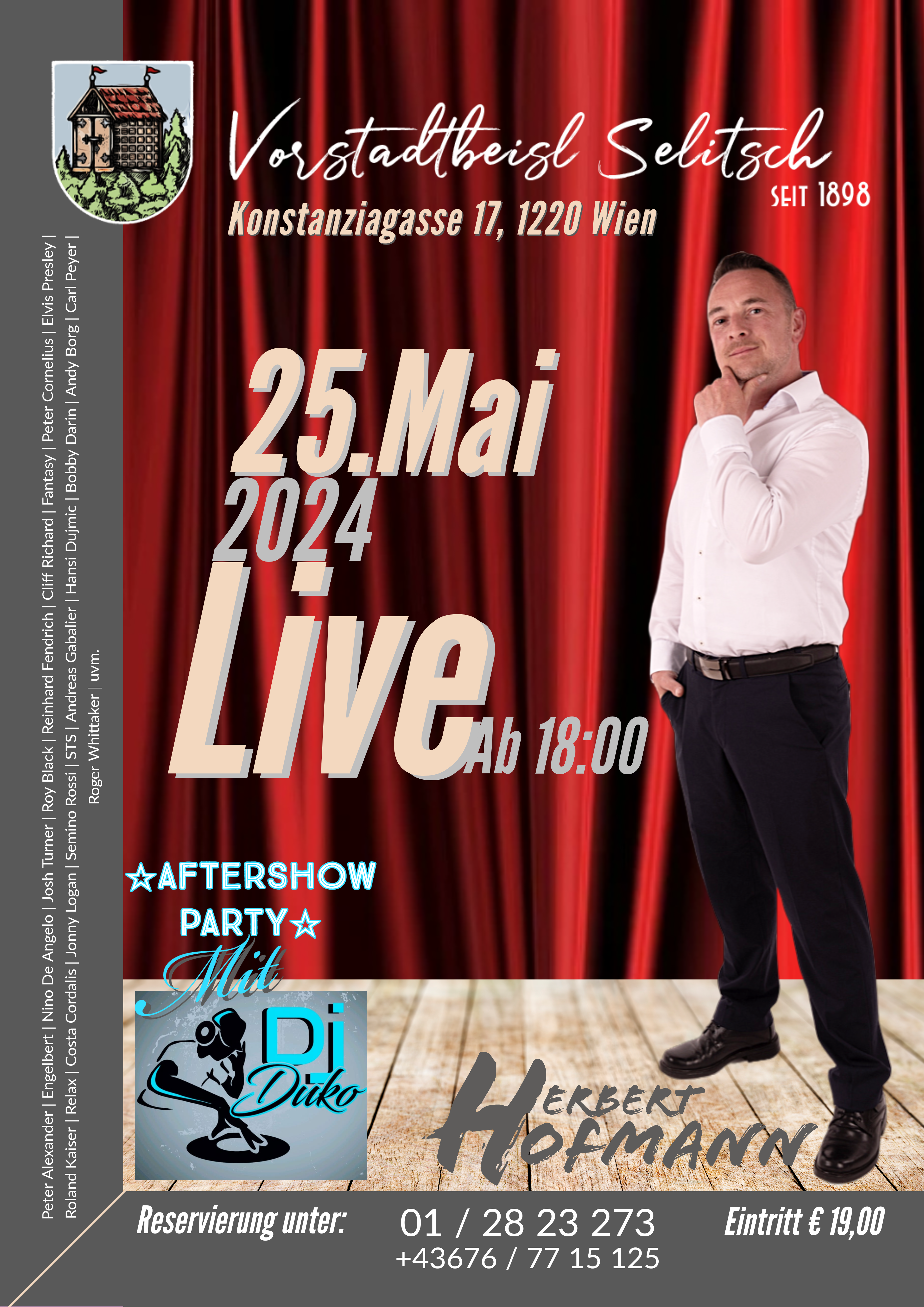 « Alle Veranstaltungen Diese Veranstaltung hat bereits stattgefunden. Vorstadtbeisl Selitsch 25.Mai, 2024 ab 18:00 - 22:00 CEST « Schlagerfrühling Vatertag Special » Zum Kalender hinzufügen Google Kalender iCalendar Outlook 365 Outlook Live Details Datum: 25.Mai, 2024 Zeit: 18:00 - 22:00 CEST Veranstaltungsort Vorstadtbeisl Selitsch Konstanziagasse 17 Wien, Wien 1220 Österreich Google Karte anzeigen Telefon 01 28 23 273